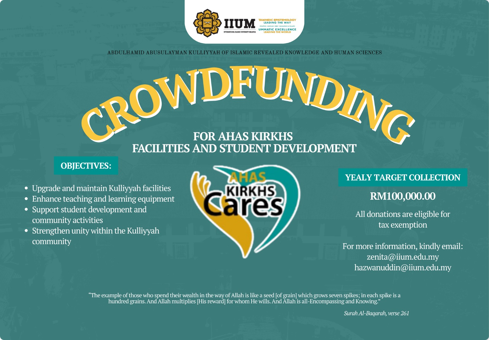 The AHAS KIRKHS Facilities and Student Development Fund established for helping the Kulliyah for the following areas: