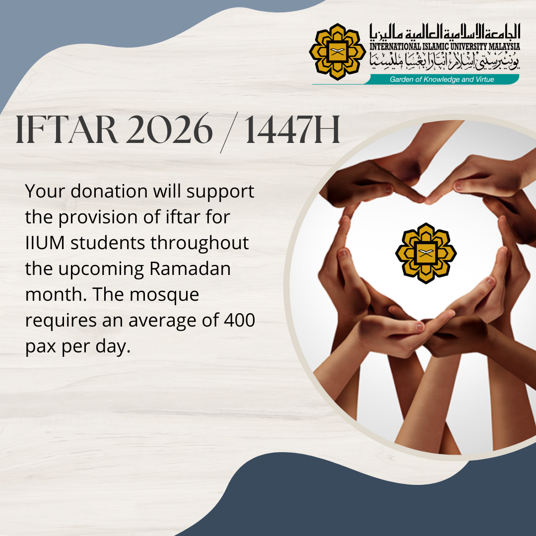 This program aims to provide daily iftar meals for IIUM community, especially needy students of the International Islamic University Malaysia (IIUM) during the month of Ramadan. Through this initiative, contributions will be channeled into a sustainable endowment mechanism, ensuring that the impact of your donation extends beyond a single Ramadan. Funds collected will support the preparation and distribution of nutritious iftar meals, fostering a caring campus environment and enabling students to focus on their studies and spiritual growth during the holy month.